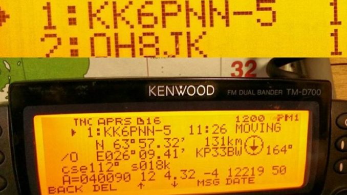 Receiving aprs reports from “strange” stations is another interesting use of 2m bandwidth. So a few days ago, when a HAB beacon appeared on the Kenwood TM-D700 solar powered APRS rig in the shack, I was very interested. It’s callsign KK6PNN-5. This is its fourth day over Finland, and at 12,000 meters, it’s developed an intimate relationship with my D700.
