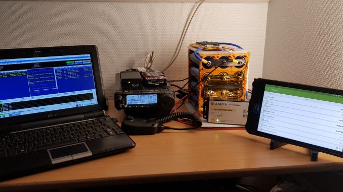 The Yaesu ft-891 is running at 50 Watts. The solar generator is also powering the Raspberry Pi, audio interface, and the laptop. The tablet on the right is running the battery monitor app on Android. It’s getting updates from the Bluetooth shunt measuring current and voltage from the solar generator.