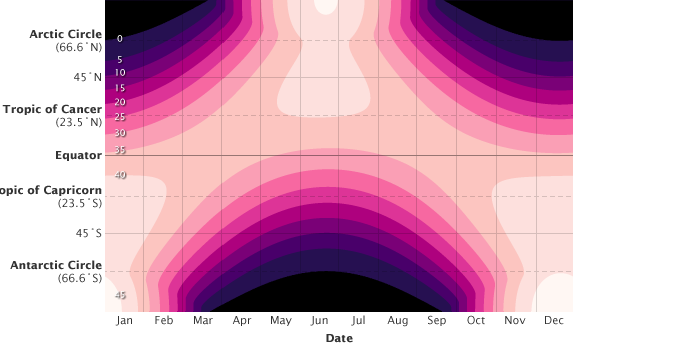 The total energy received each day at the top of the atmosphere depends on latitude. The highest daily amounts of incoming energy (pale pink) occur at high latitudes in summer, when days are long, rather than at the equator. In winter, some polar latitudes receive no light at all (black). The Southern Hemisphere receives more energy during December (southern summer) than the Northern Hemisphere does in June (northern summer) because Earth’s orbit is not a perfect circle and Earth is slightly closer to the Sun during that part of its orbit. Total energy received ranges from 0 (during polar winter) to about 50 (during polar summer) megajoules per square meter per day.