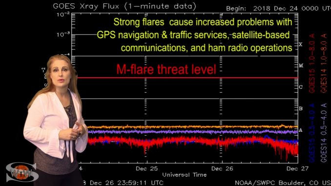 Our Sun decides to celebrate New Years early this week with some fast wind from a familiar coronal hole that has brought us multiple solar storms in past months. True to form, it has bumped us up to solar storm conditions and has brought aurora down to mid-latitudes in several parts of the world. Storm effects including aurora views should continue over the next few days and at high latitudes, possibly into the new year before things quiet down. Despite the Sun being spotless, we do have a bright region lighting up the Earth-facing Sun this week. It has been enough to keep the solar flux near the low end of marginal for radio propagation on Earth’s day side and will continue to do so over this next week. Learn the details of the ongoing solar storm, how it is affecting GPS, amateur, and shortwave radio on Earth’s night side, catch up on aurora photos from the storm thus far, and see what else our Sun has in store this week!