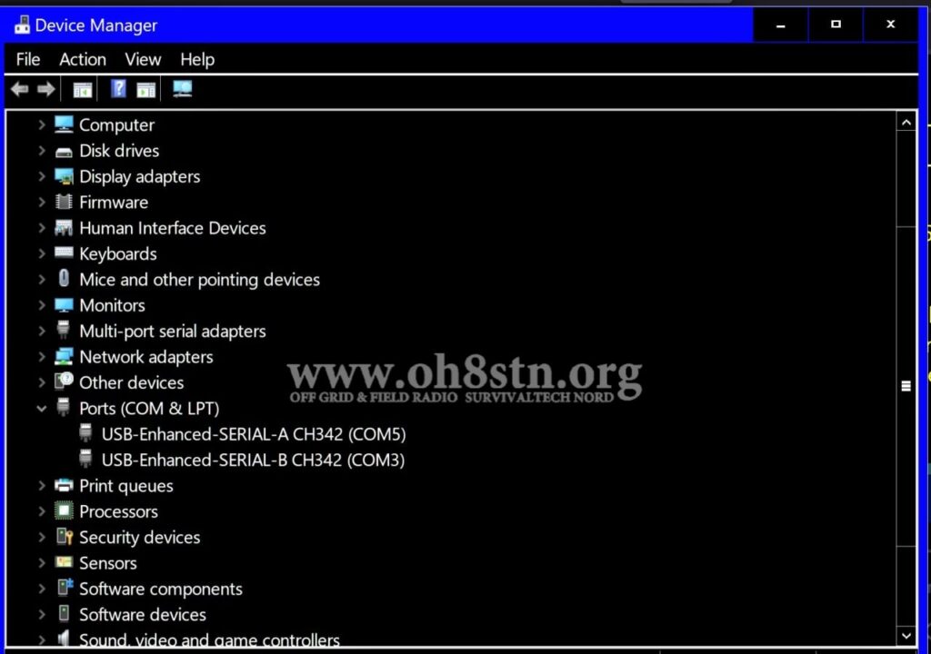 Before anything else, plug in the USB cable into the “DEV” USB-C socket of your x6100. When you turn the radio on, you’ll get two ports popping up in the ports section of the Windows Device manager. Make a note of those ports, and their speeds. At the moment I don’t understand the difference between the two different ports Serial A and Serial B. We will only be using one of them for Winlink Express.